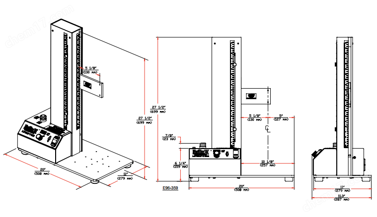 Deflection limit switches are supplied on the front of the column. The column contains increments in inches and millimeters for positioning the limit switches and for measuring sample deflection. Position andlock-in” a High and Low deflection limit to protect your gauge from overload conditions or for ending your test at a distance traveled. The crosshead travels up to 15-inches (380mm).