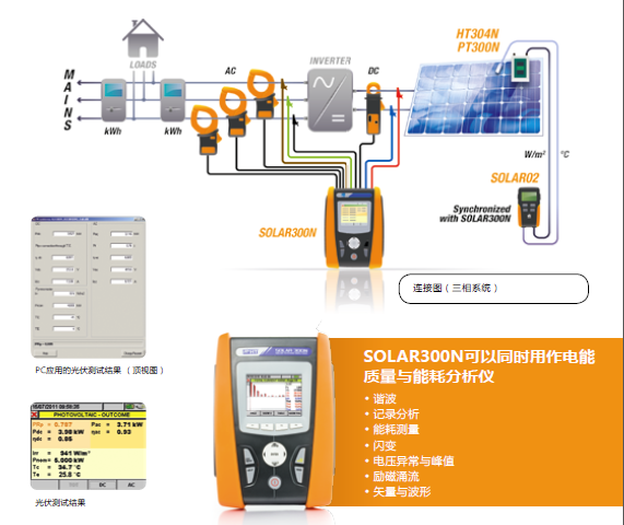 SOLAR 300N,是專為光伏發電係統研究開發的,用於測試和驗證單相和三相太陽能光伏係統的主要性能與參數的專門儀器,並同時具備專業電能質量分析測試的多功能儀表。